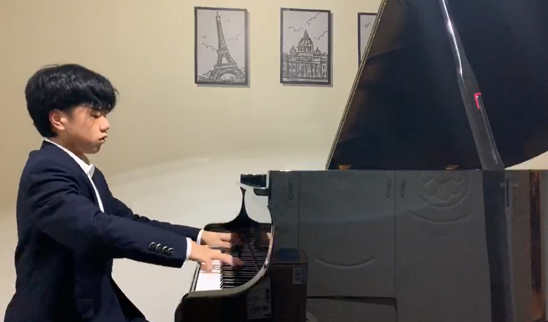 钢琴专业的陈炳宏同学带来了自己谱曲并亲自弹奏的原创钢琴曲《红船颂》。只见他的指尖在黑白琴键上快速翻飞,弹奏出振奋人心、慷慨激昂的曲调,表达出爱党、爱国的情怀。在他表演期间,还有不少同学都用弹幕为他留言点赞。