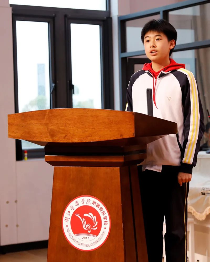 初三(1)班钢琴专业的白子俊同学代表全体初三学生发言。他结合自身学习经历,分享了提高学习效率的方法,以知识为利刃,以坚固为盾牌;一腔热血,满怀信心,朝着自己的目标坚毅前行!白子俊同学的发言发自肺腑、掷地有声,道出了全体同学的决心和自信。