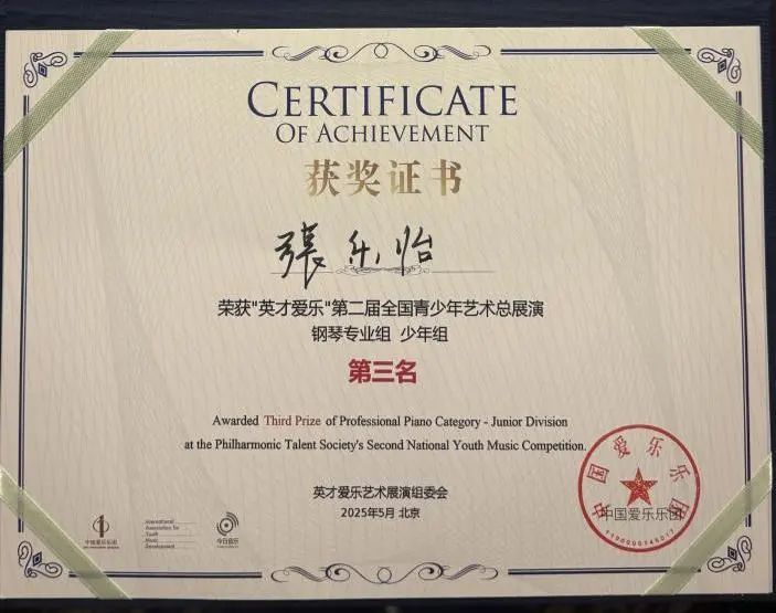 张乐怡,女,13岁,浙江音乐学院附中钢琴专业初二学生,师从钢琴家吴晓副教授。入学以来,先后荣获第七届、第八届浙江音乐学院附中雅马哈亚洲奖学金钢琴比赛初中组第三名;2024年哈恰图良国际青少年比赛全球预选赛钢琴专业青少年A组一等奖;2025年第三届凤凰花国际音乐艺术节专业儿童组第三名,2025年第二届英才爱乐全国青少年艺术总展演专业少年组第三名。