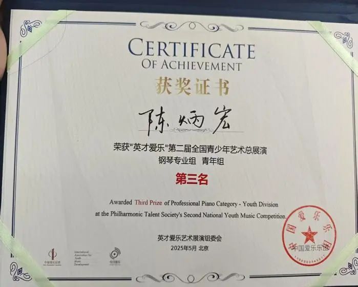 在刚刚结束的第二届“英才爱乐”全国青少年艺术总展演中,浙音附中钢琴专业高二学生陈炳宏(指导教师:刘倩芸)、初二学生张乐怡(指导教师:吴晓)分别荣获青年专业组、少年专业组第三名,并获奖励受邀参加在上海原新天安堂(不止空间)联合独奏音乐会演出。