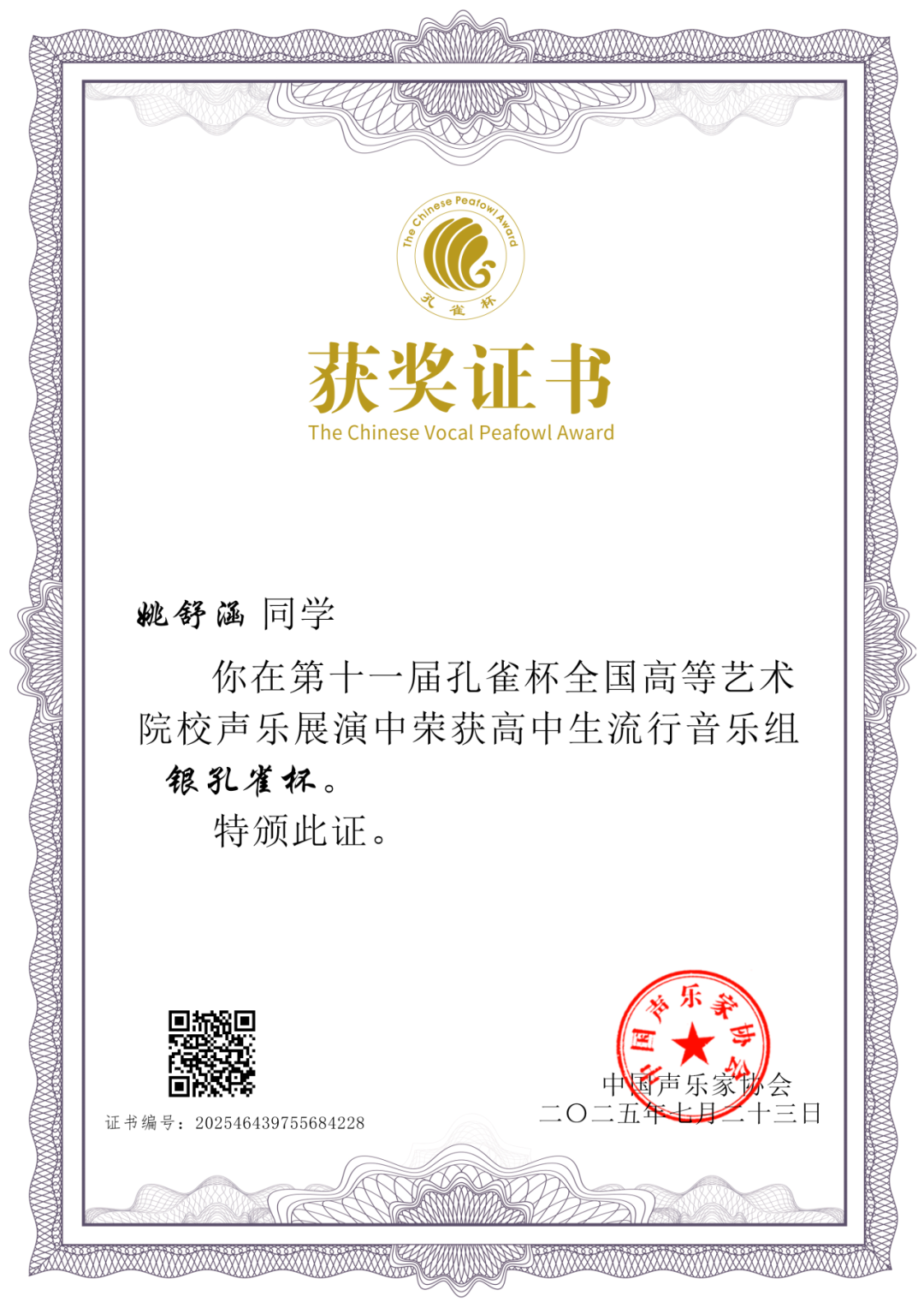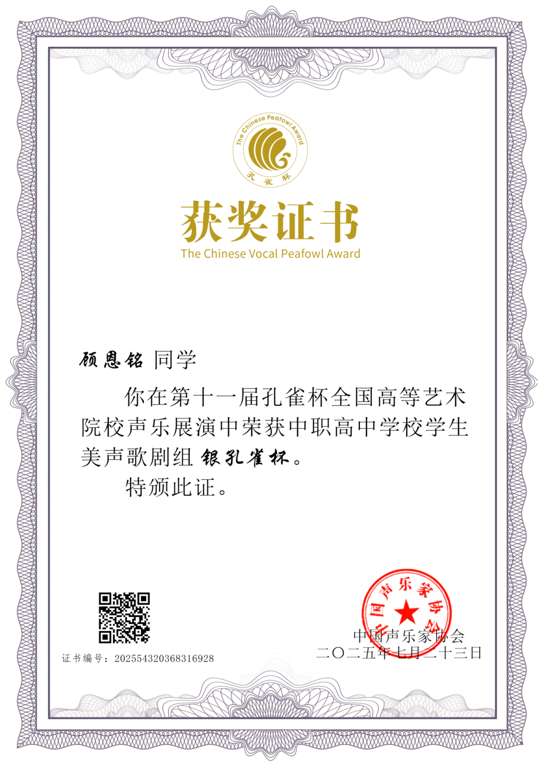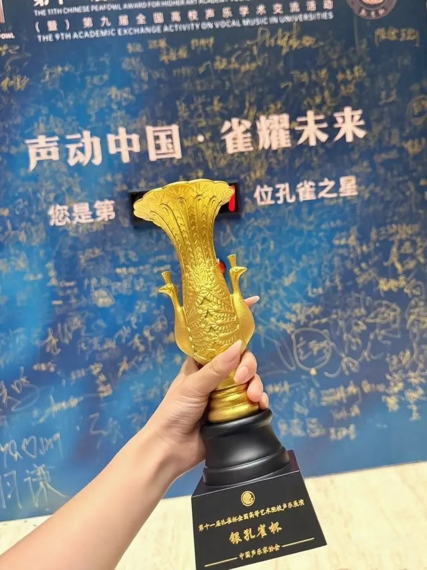 由中国声乐家协会、孔雀杯组委会主办的2025第十一届“孔雀杯”全国高等艺术院校声乐展演及系列活动于7月16日至23日在星海音乐学院音乐厅隆重举行。在此次高水平的专业赛事中,我校学子表现优异,斩获两项大奖: