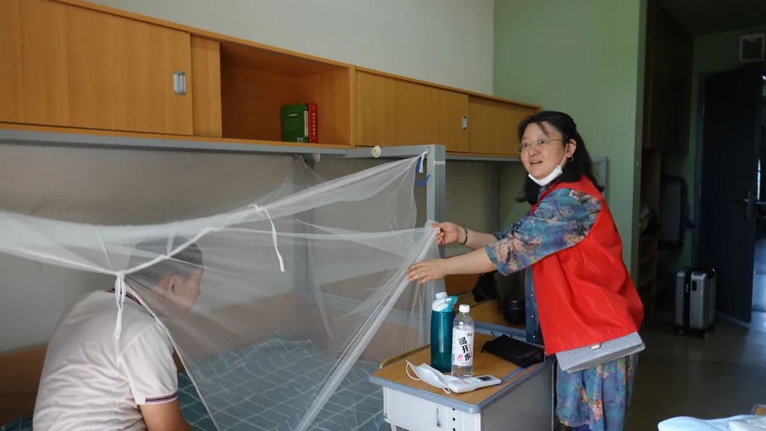 根据疫情防控的需要,家长不能陪同进校,学校不仅安排了学生志愿者,全体老师都作为志愿者参与了新生报到服务,并且每个寝室都安排了一名教师指导新生整理内务,细致贴心,热情服务。