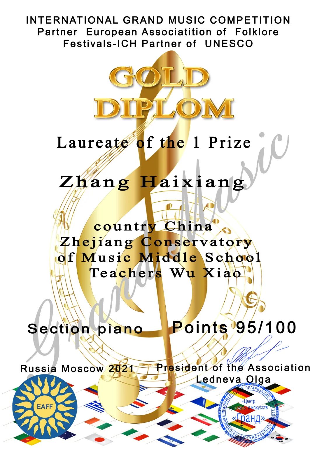 在10月刚刚落下帷幕的2021年西班牙瓦伦西亚国际音乐大奖赛和俄罗斯莫斯科国际音乐大赛中,我校初二年级钢琴专业的张海翔同学分别获得钢琴独奏第一名、钢琴独奏第三组一等奖。
