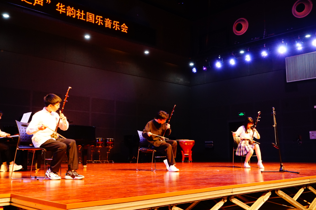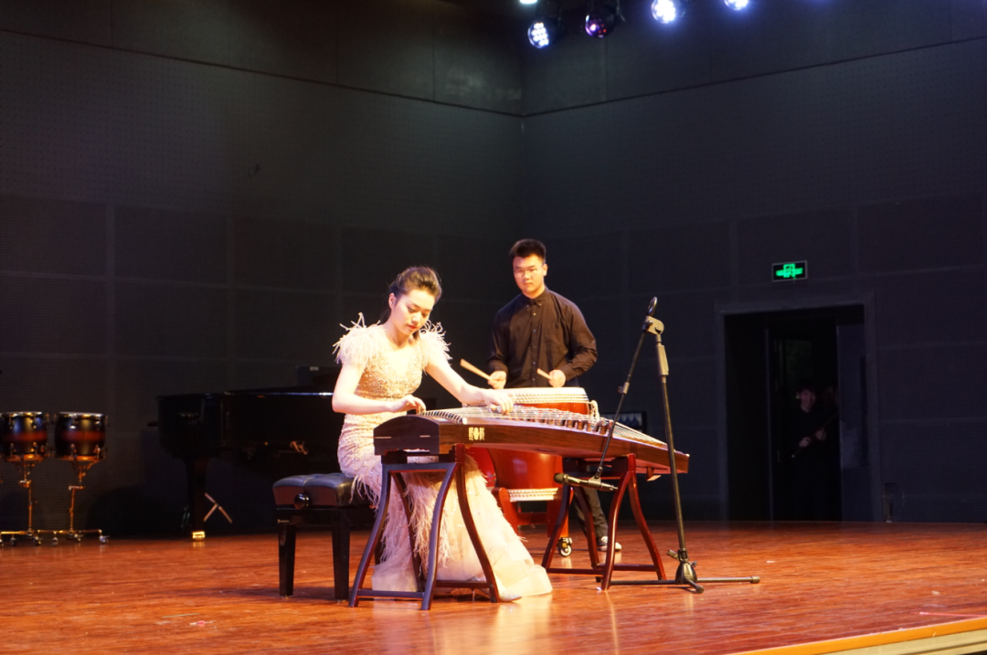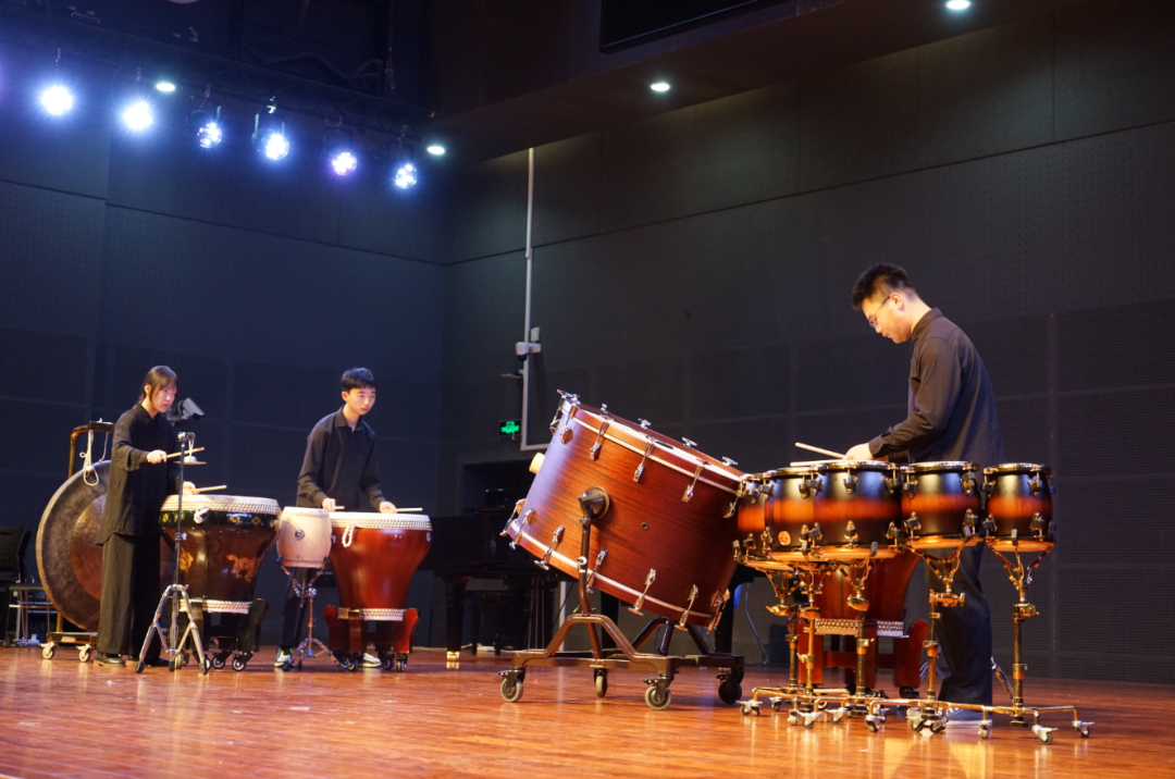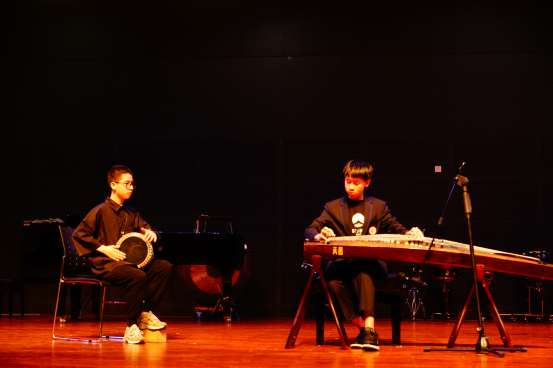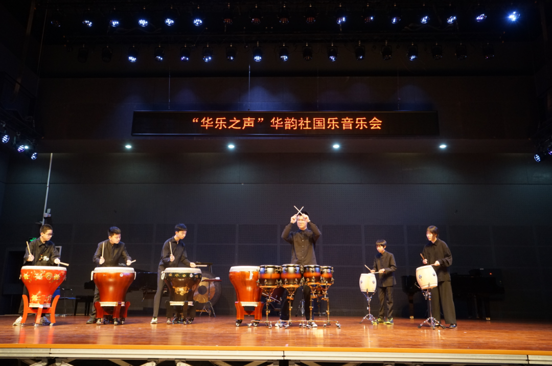接下来,由陈果老师担任钢琴艺术指导,闵睿同学演奏的古筝独奏《秦土情》;王子睿和陈梓毓同学带来的具备新疆维吾尔族舞蹈特色的古筝作品《伊犁河畔》;王屹杨、金晗意、顾泽南三位同学的二胡齐奏《蒙风》;潘静瑜同学带来的古筝演奏《苍歌引》等曲目一一上演,并最终在徐子杰、綗焱飞、陈恩晞三位同学的排鼓作品《云之南》的高昂乐声中,把音乐会推向了高潮。