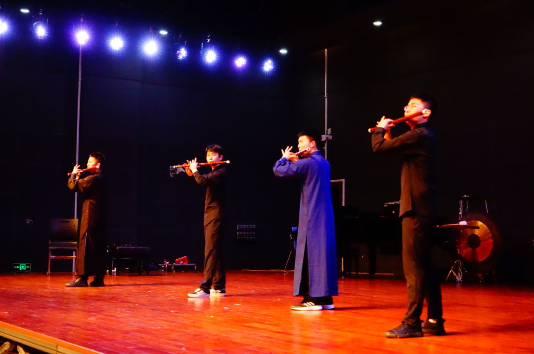随后是由姜鉴航、张徐丽慧、张徐丽泰、陈家烨4位同学带来的竹笛齐奏《春潮》,令观众仿佛看到了春日乌苏里江冰雪消融,江上船歌回荡,千舟弄潮捕鱼的画面。同学们在排练该曲目时尝试了改编部分乐段,以二重奏的形式丰富了新的演奏方式,听来让人耳目一新。