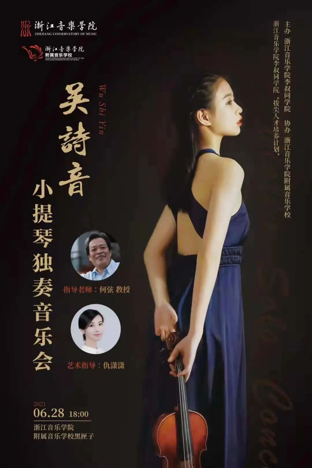 吴诗音,浙音附中初三(2)班小提琴专业学生,2015至2016年获上海“海曲杯”少儿小提琴比赛铜奖、银奖,上海市中小学生艺术单项比赛银奖。2016年获第6届香港国际小提琴大赛精英奖、上海赛区二等奖。2018年以专业第一的成绩考入浙江音乐学院附属音乐学校,曾任浙音附中弦乐团首席,在校期间专业成绩优异,连续两年获得浙音附中专业奖学金,2020年入选浙江音乐学院李叔同学院“拔尖人才培养计划”。现跟随上海音乐学院何弦教授学习。