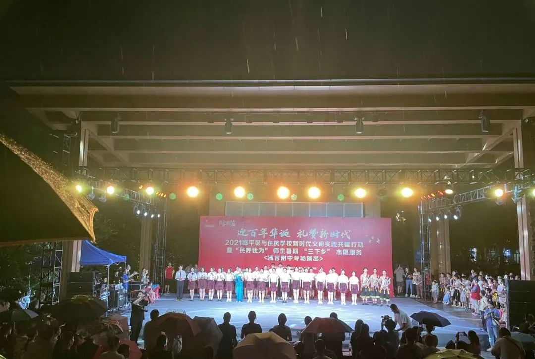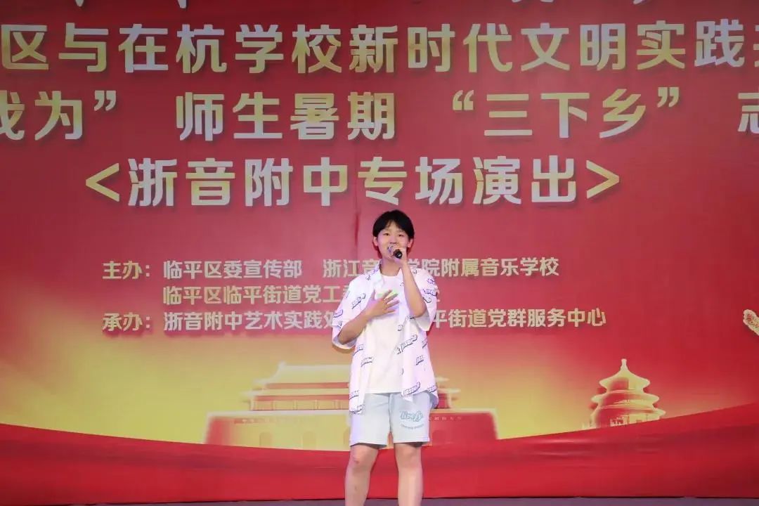 除了在衙前镇的精彩演出外,浙音附中另有一支暑期艺术实践小分队走进了临平文化艺术长廊临里大舞台,开展“2021年临平区与在杭学校新时代文明实践共建行动暨‘民呼我为’师生暑假‘三下乡’志愿服务”,以经典文艺作品舞台呈现的方式,向党的生日献礼,也向关心附中的各级领导和社会各界汇报了学习成果。