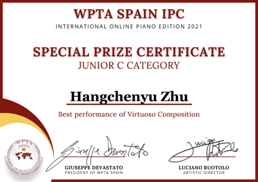 在刚刚结束的2021WPTA西班牙IPC比赛中,我校初二学生朱航晨宇荣获C组第一名及“大师作品最佳演奏”特别奖。