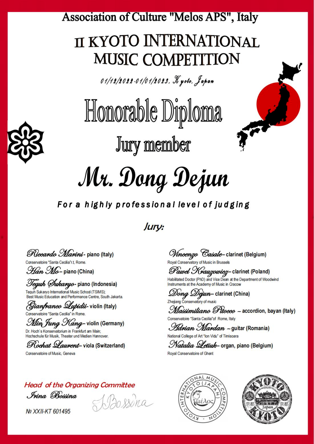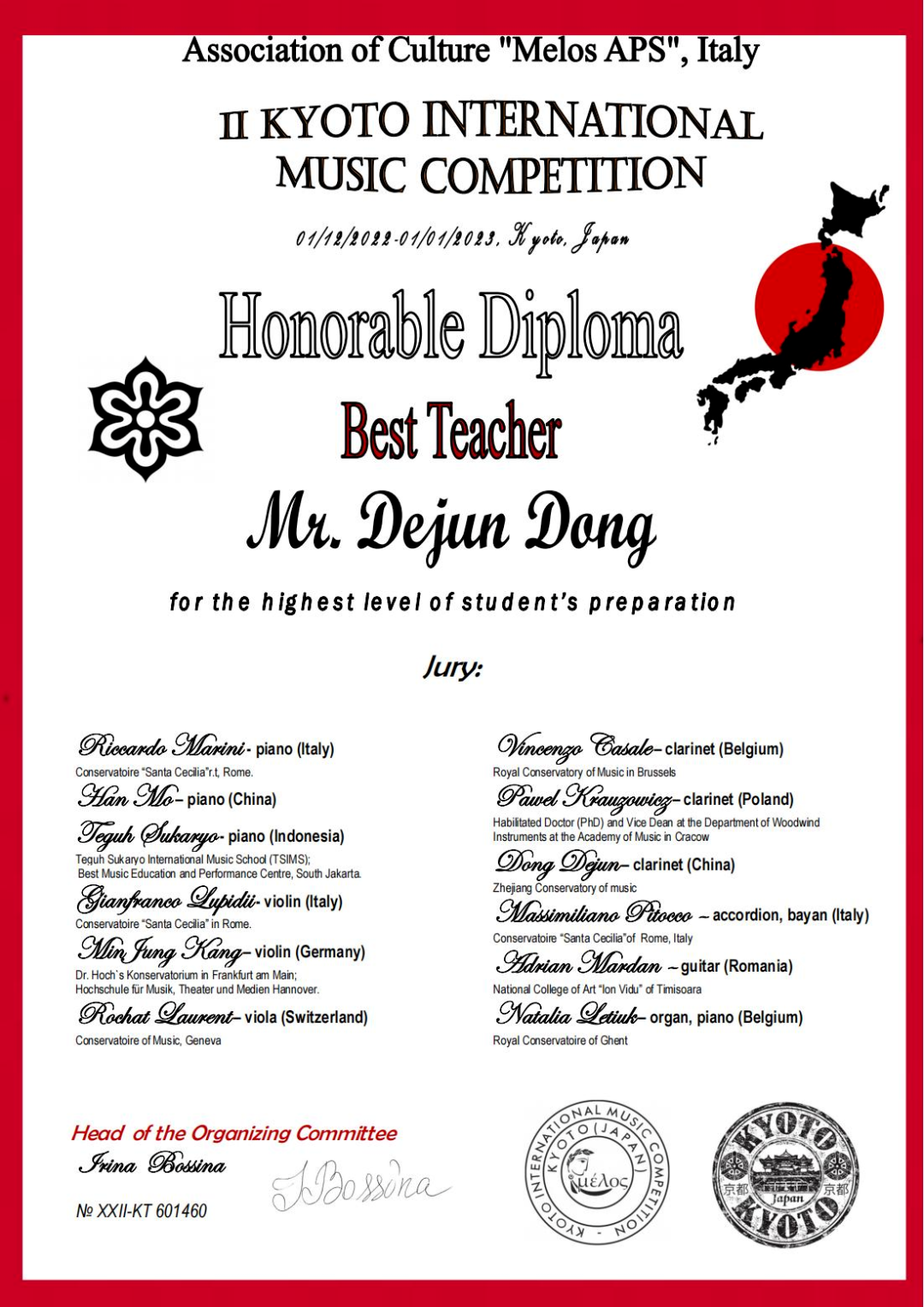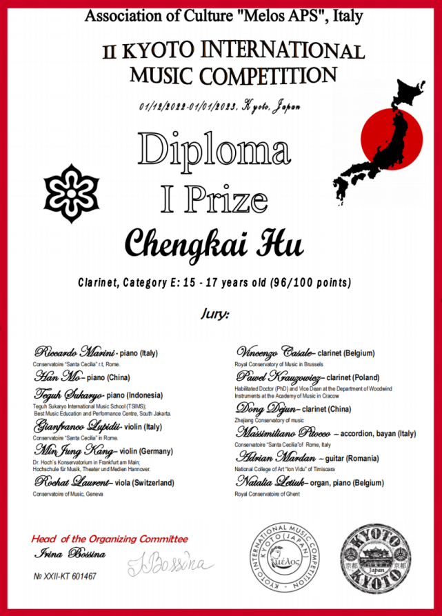 近日,在日本京都国际音乐大赛中,我校高三管弦专业胡成凯同学荣获单簧管E组一等奖,指导教师董德君教授荣获“最佳教师”奖。向胡成凯同学及指导教师董德君教授表示热烈的祝贺!