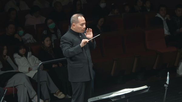 著名作曲家刘锡津的《雪意断桥》,由青年教师韩慧慧担任竹笛独奏。其声腔化的演奏处理,在清亮而克制的音色中,勾勒出江南特有的含蓄情致。笛音在乐队营造的“雪景”织体中穿行,既有画面感,又保留了情感的留白,展现了独奏者教师与学生乐团之间的一种稳定而开放的音乐关系。