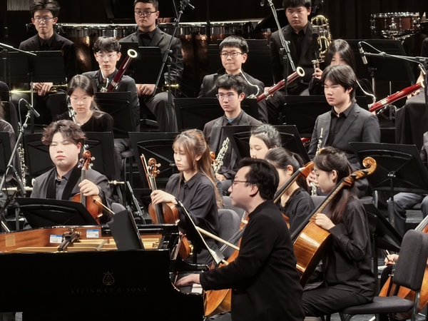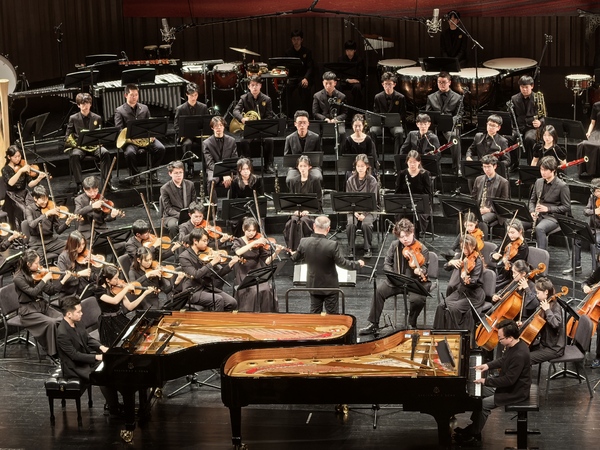 这是莫扎特唯一的双钢琴协奏曲,两台钢琴在音符间彼此倾听、相互托举,与乐团形成严密而自然的呼吸关系。这里既有成熟演奏者对结构与风格的从容把控,也有学生乐手的信任与成长,仿佛一种无需言说的默契——师生在同一音乐语境中彼此理解、共同完成,而舞台也成为最直观的教学现场。